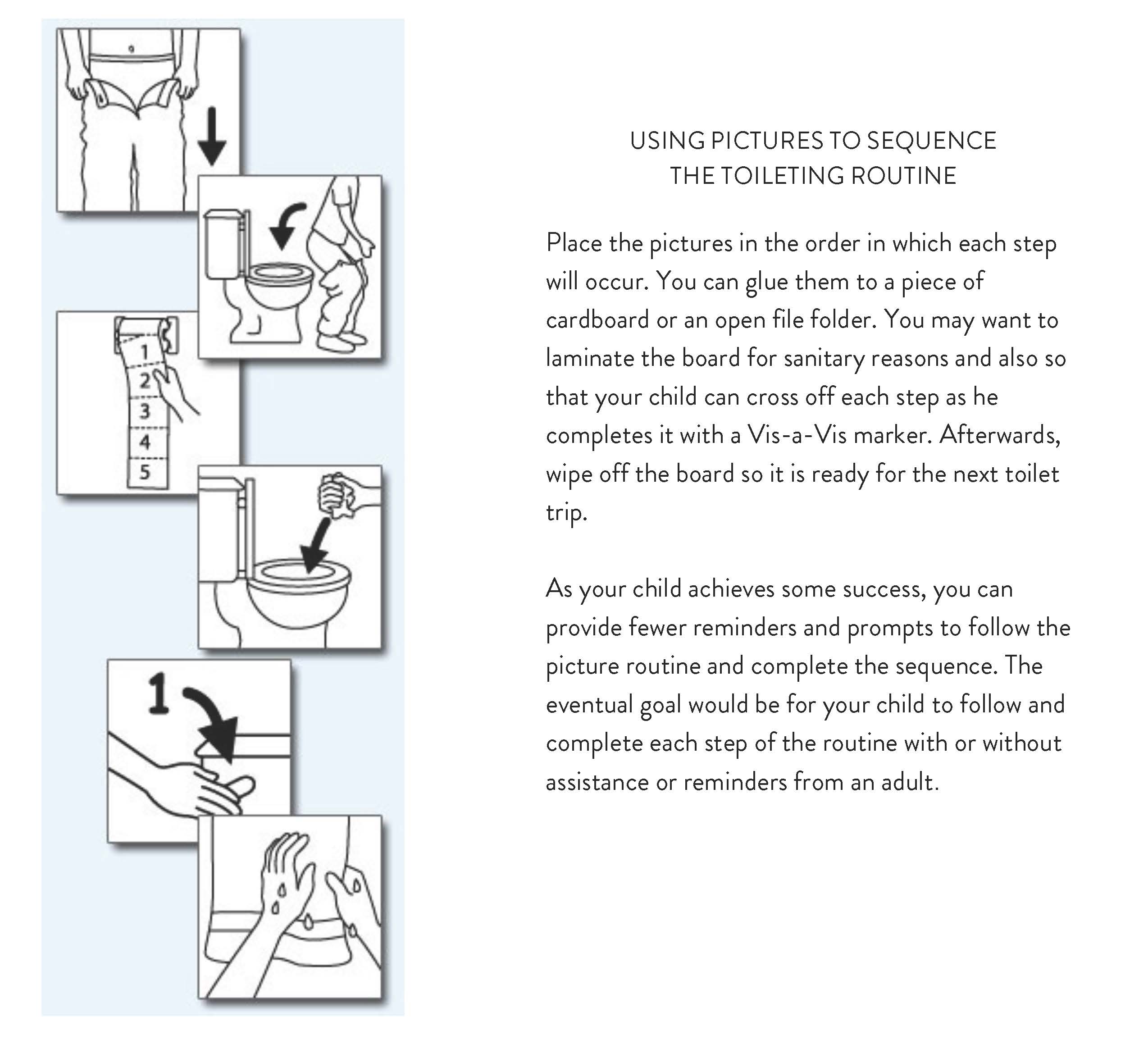 For most children, the adult(s) will be teaching, supporting, and supervising all of the steps in the toileting sequence. Some children may have already mastered some of these steps and do not need to be taught those parts of the sequence. To help your child learn and follow the routine, use pictures to represent the steps he needs to know. As you help him follow the sequence of the routine, show or point to the picture and say the words. You can find pictures online or in magazines, take photographs, or you can draw them with stick figures. Your child’s school may also be able to help with acquiring the pictures you need. As your child learns the toileting routine, he may need less or even no help with some or all of the steps of the sequence.