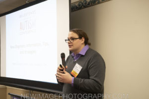 Milestones Early Intervention/School Age Coordinator Nathan Morgan did a total of three workshops! He started the conference out with a session sharing tips and suggestions for families to follow after receiving a new diagnosis of autism – Nathan reviewed common evidence-based therapies, how to access them, and how to work with school districts. Nathan then served as a moderator on the Straight from the Source: Autism at Work panel, where he led a discussion with four other adults with ASD about their path to employment. Nathan and Molly then closed the conference with another staff advocate and Milestones volunteer, Grace Blatt, where they shared their practical strategies for dealing with common sensory issues.